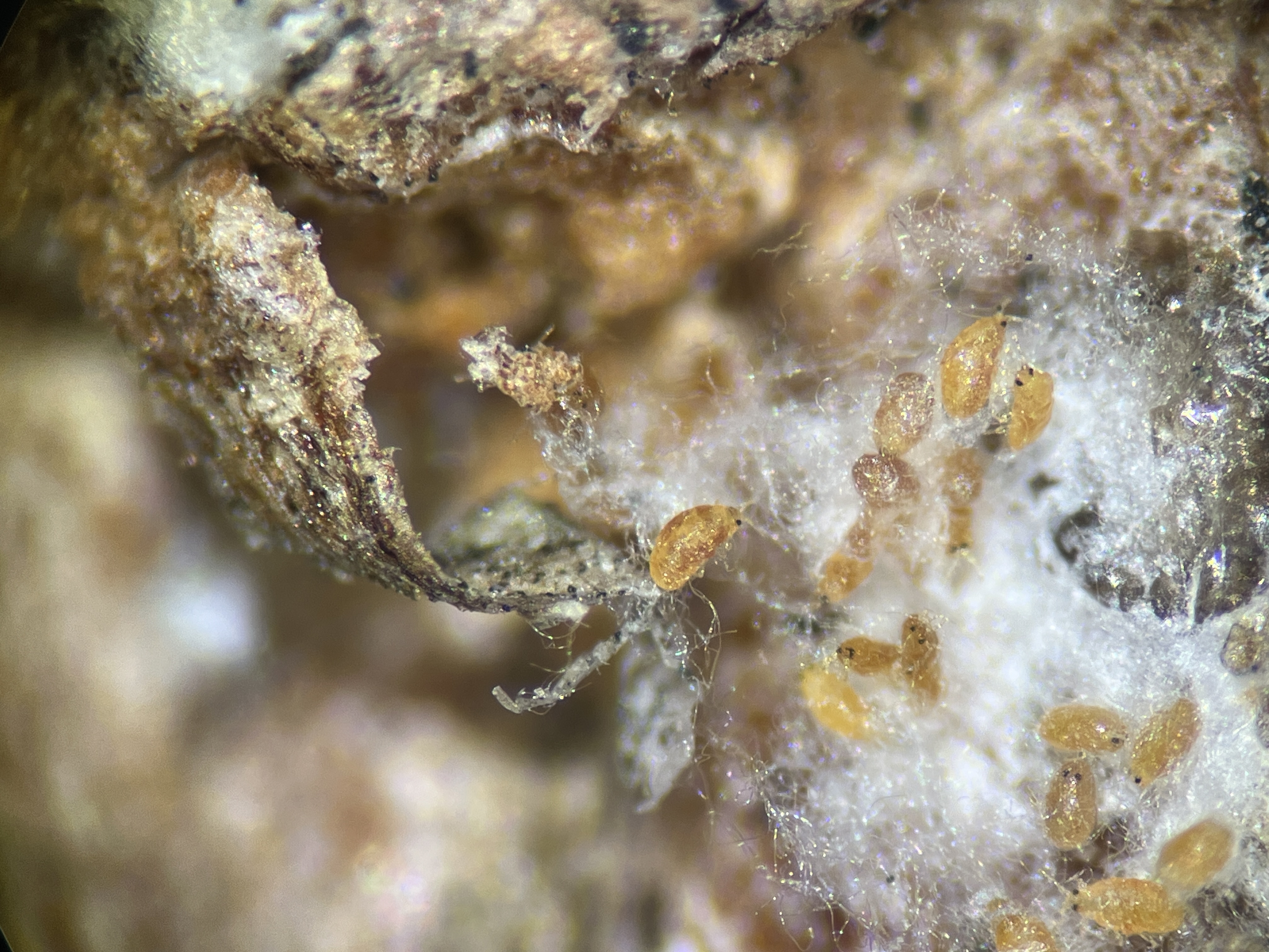 Adult females are brick-red, wingless, soft-bodied insects with well-developed legs and antennae. They are approximately 1/16” - 3/16” long, pear shaped, and coarsely wrinkled. Adult males are smaller (1/32” - 1/16”), twowinged, midge-like insects. First-instar larvae resemble females but are much smaller (~0.01”). Intermediate stage larvae are elliptical in shape and lack both legs and antennae. They resemble smooth, waxy pods and have sparse tufts of white wool. Females deposit small, yellow eggs in a white, woolly ovisac, and sub-adult males spin white, capsule-shaped, loosely woven cocoons.